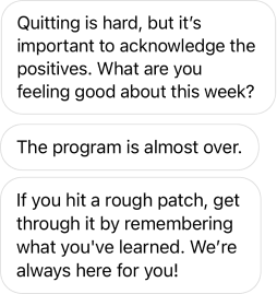 We keep up the motivation and energy, and we spend some time preparing for triggers after the program ends. And, we celebrate how far all of you have come, whether you haven’t vaped since quit day or you’ve slipped up a time or two.